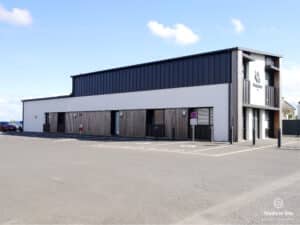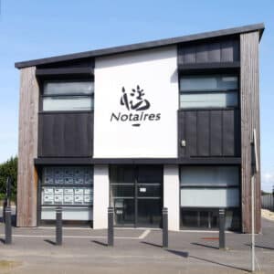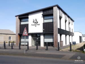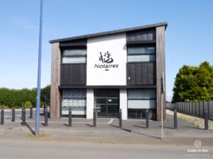 L’étude notariale de Plouvorn vient s’installer à quelques mètres de ses anciens locaux devenus inadaptés à l’accueil du public. Ce nouveau bâtiment dispose de tous les espaces utiles quotidiennement en plain-pied et un étage pour les archives. L’entrée se fait depuis la rue à l’Ouest où la réflexion en façade nous a amené à créer un ensemble qui attire le regard et fait rapidement comprendre la fonction de cette construction. Le bureau d’accueil et celui réservé à la négociation commerciale des biens à vendre encadrent le sas de l'entrée du public. Une grande salle de réunion permet d’accueillir une douzaine de personnes à la fois. Les bureaux des collaborateurs profitent de l’exposition Sud et Est et sont regroupés dans une zone du bâtiment non accessible au public afin de préserver le calme des lieux. En façade, un jeu de textures rythme ce bâtiment tout en longueur : l’enduit blanc est ainsi structuré par du bardage bois et du bardage en zinc noir.